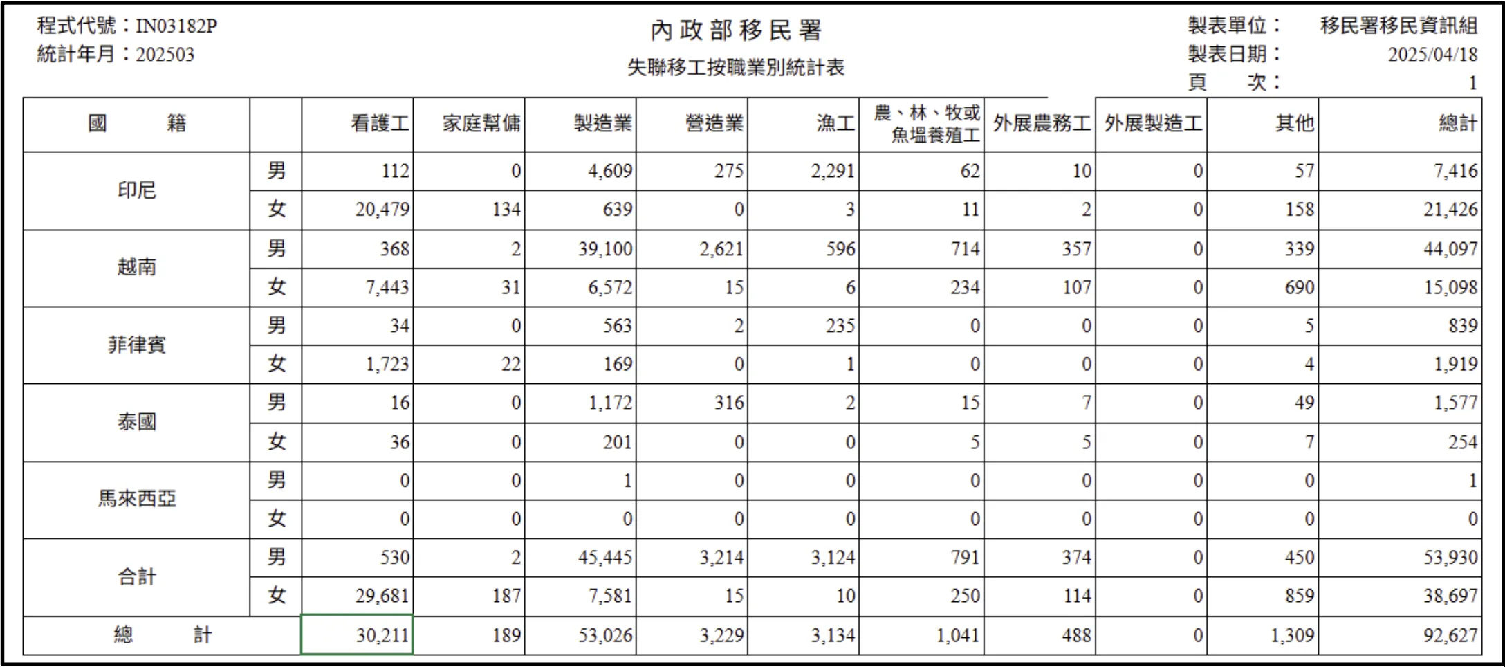 您知道嗎?截至114年3月份為止,內政部移民署統計失聯移工人數已有92,627人!失聯比例高達11%!