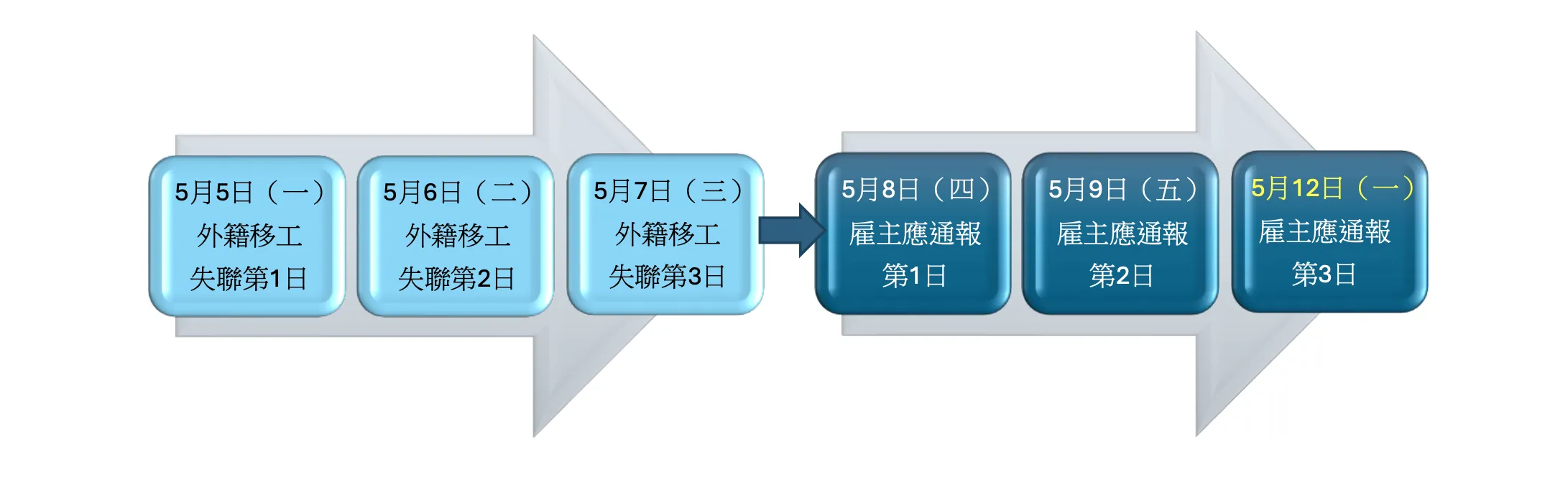 如外勞連續曠職且失去聯繫已達3日,此時雇主應於3日內以書面通知當地勞工局、勞動部、移民署及警察機關。若遇通報第3日為星期日、國定假日或其它休息日時,可順延1日。